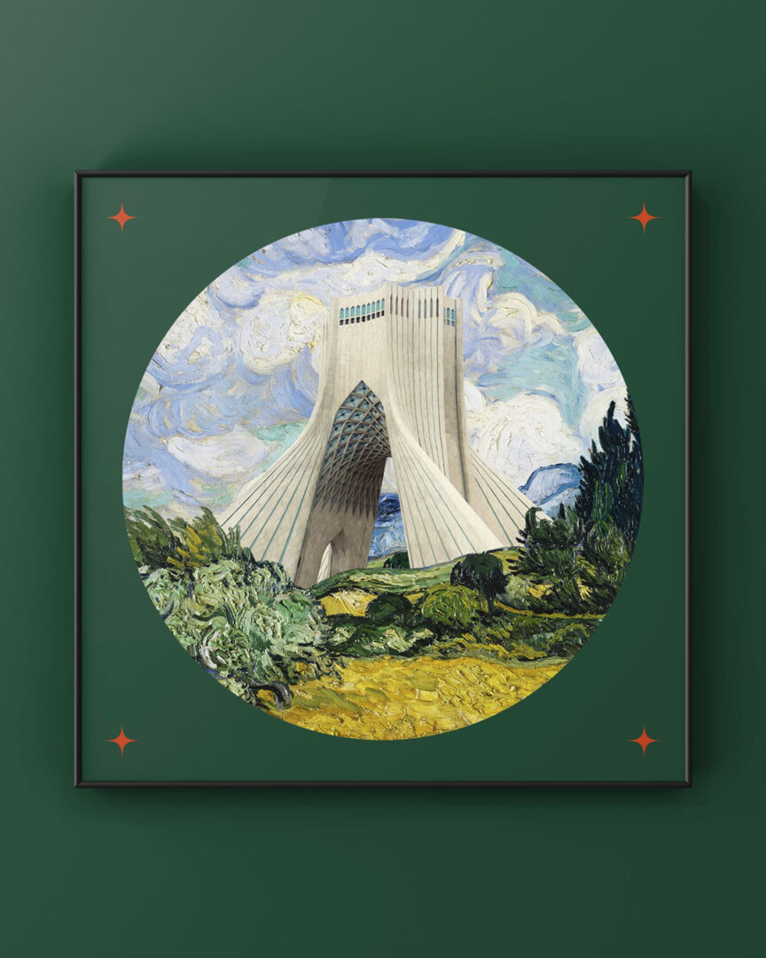 - کنار «درخت سرو» در گندمزار ونگوگ، که در فرهنگ ما نماد جاودانگی و آزادگی است، برج آزادی استوار ایستاده. این تصویر، پیوند عمیق میان پایداری یک ملت و رویایی است که با وجود تمام بادهای مخالف، همچون «سرو آزاد» ریشهدار و سر به فلک کشیده باقی میماند.